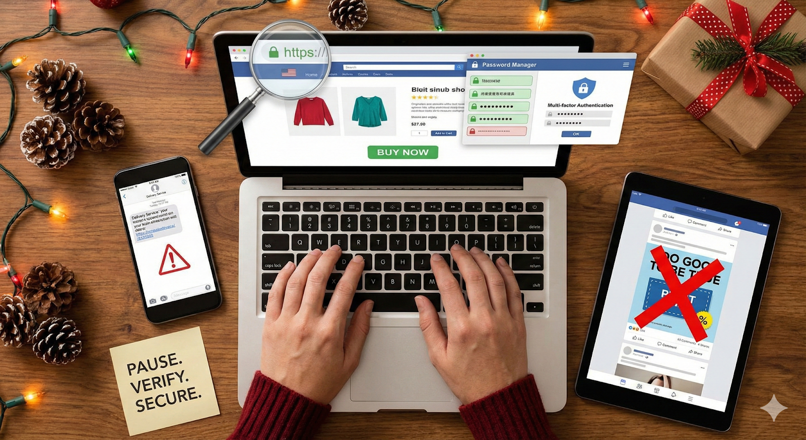Holiday shopping should be fun — not stressful. While scams ramp up this time of year, you can stay safe by slowing down, checking websites carefully, securing your accounts, being cautious about ads and messages, and keeping your devices protected.